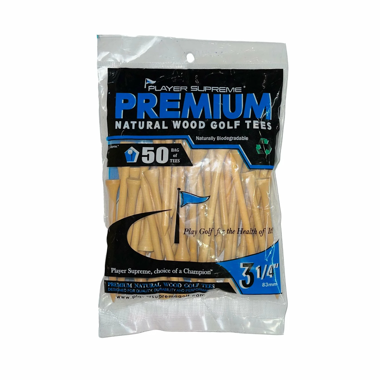 Perfect for golfers looking for performance quality and consistency in heights are the JP Lann Player Natural 3 1/4 in Golf Tees. These tees are made from all natural wood material with 50 tees in each package.