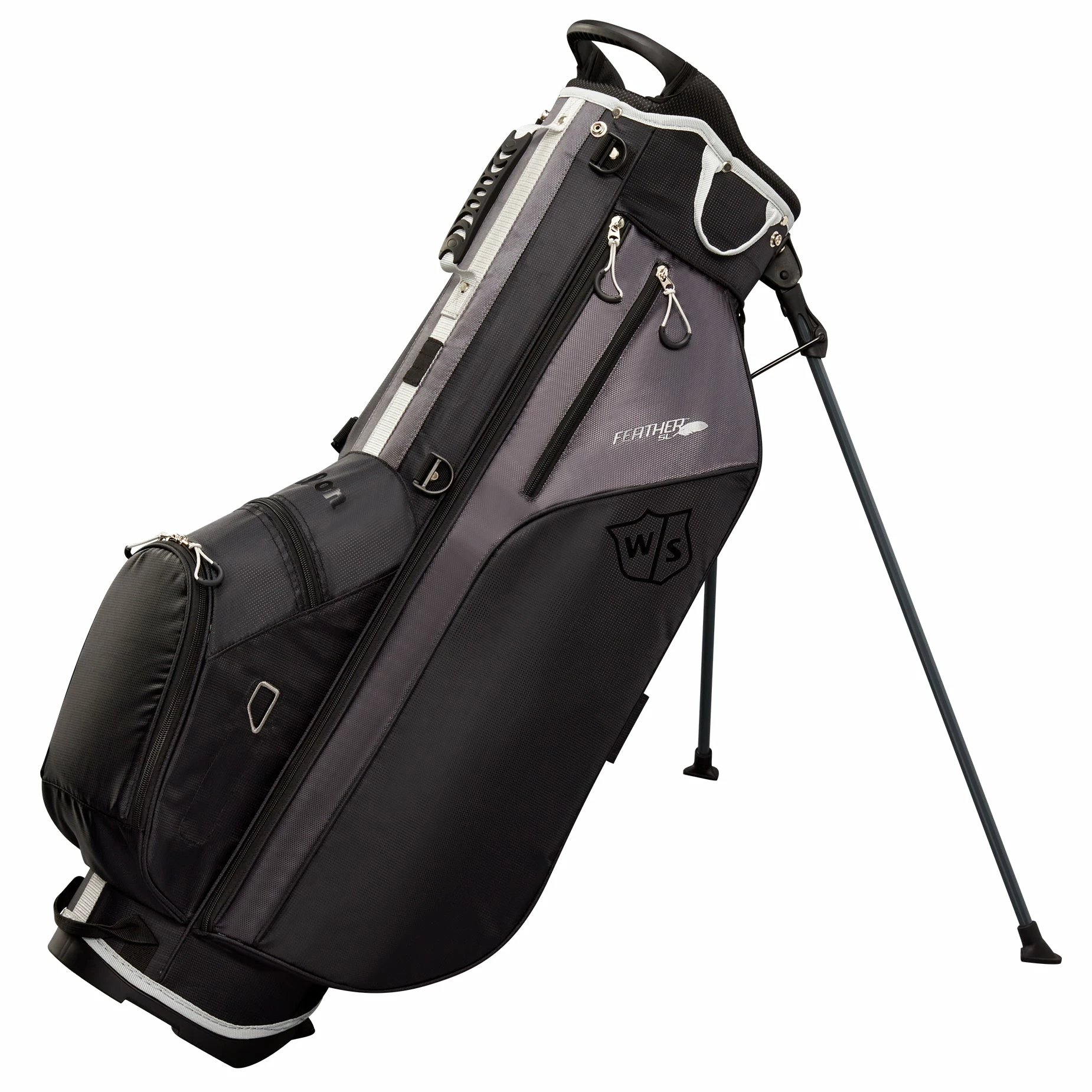 Get everything you need in a functional bag with the Wilson Staff Feather Golf Stand Bag. The Feather stand bag is lightweight and will not break your back and is loaded with many features. There is a five-way top with molded handle with two full length dividers that provide a few ways to keep your clubs separated. There are five pockets that are great for storing your golf essentials and there is a mid size ball and tee pocket and a large open pocket that can hold a few beverages or a range finder. The Slide 2-in-1 self-balancing strap system with a four-point double strap and ergonomic padded strap which ensures you can comfortably carry this bag as you walk the course.